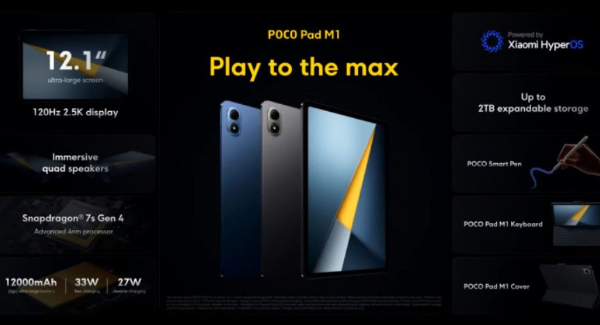 Аппаратная часть устройства полностью совпадает с оригинальной моделью. Планшет оснащён 12,1-дюймовым IPS-дисплеем с частотой обновления 120 Гц, чипсетом Snapdragon 7s Gen 4, аккумулятором на 12 000 мА·ч, четырьмя динамиками, а также двумя редкими для современных планшетов элементами — 3,5-мм аудиоразъёмом и слотом для microSD до 2 ТБ. Поддерживаются фирменный стилус и магнитная клавиатура. На мировом рынке планшет POCO Pad M1 оценили в $329.